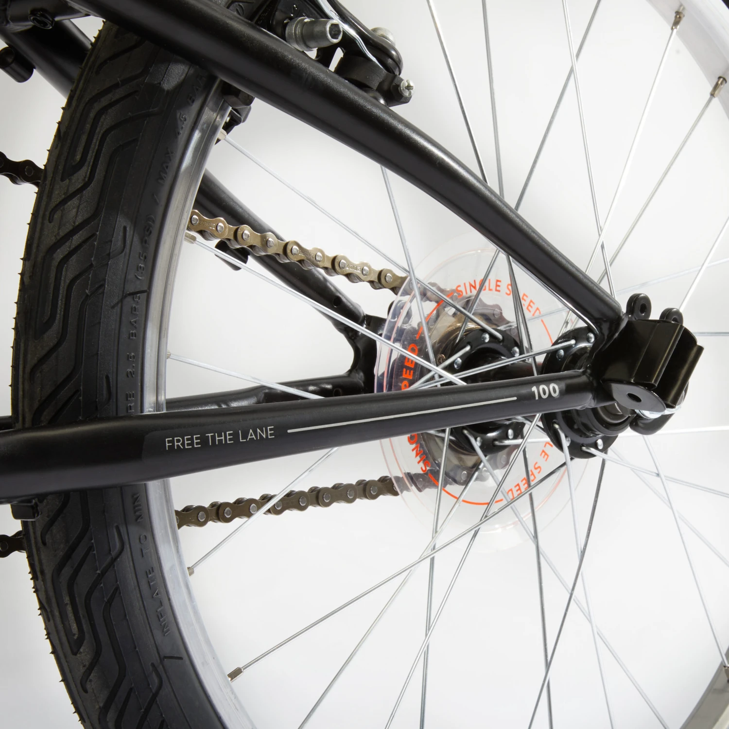 This single-speed drive train has been developed for various riding conditions. Easy to set off and also fast on the flat. 165 mm cranks, 44-tooth chainring, 16-tooth freewheel cog.