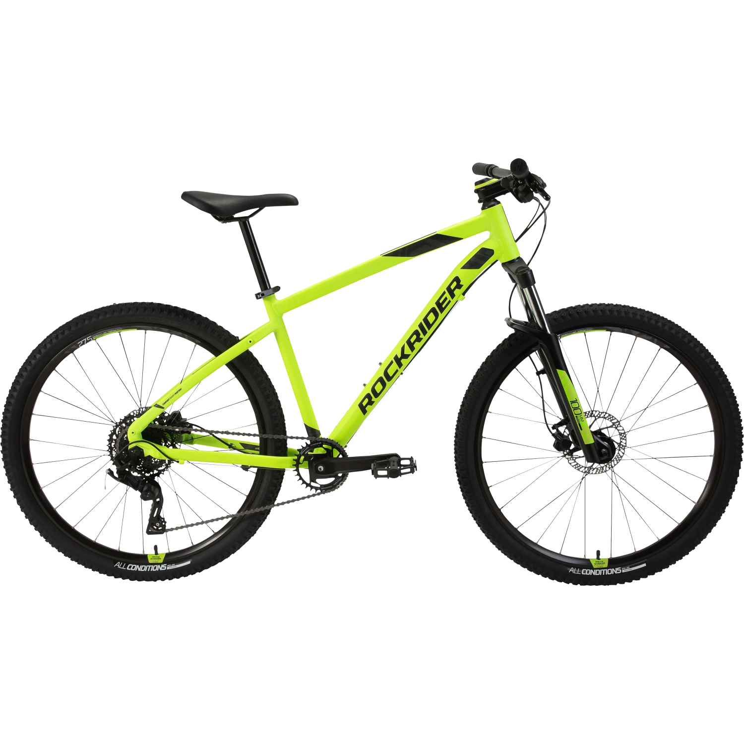 The wide, exclusive ROCKRIDER ALL CONDITIONS (30 TPI) 27.5″ x 2.0 tyres have side knobs designed for riding on all types of terrain (dry, wet, etc.).