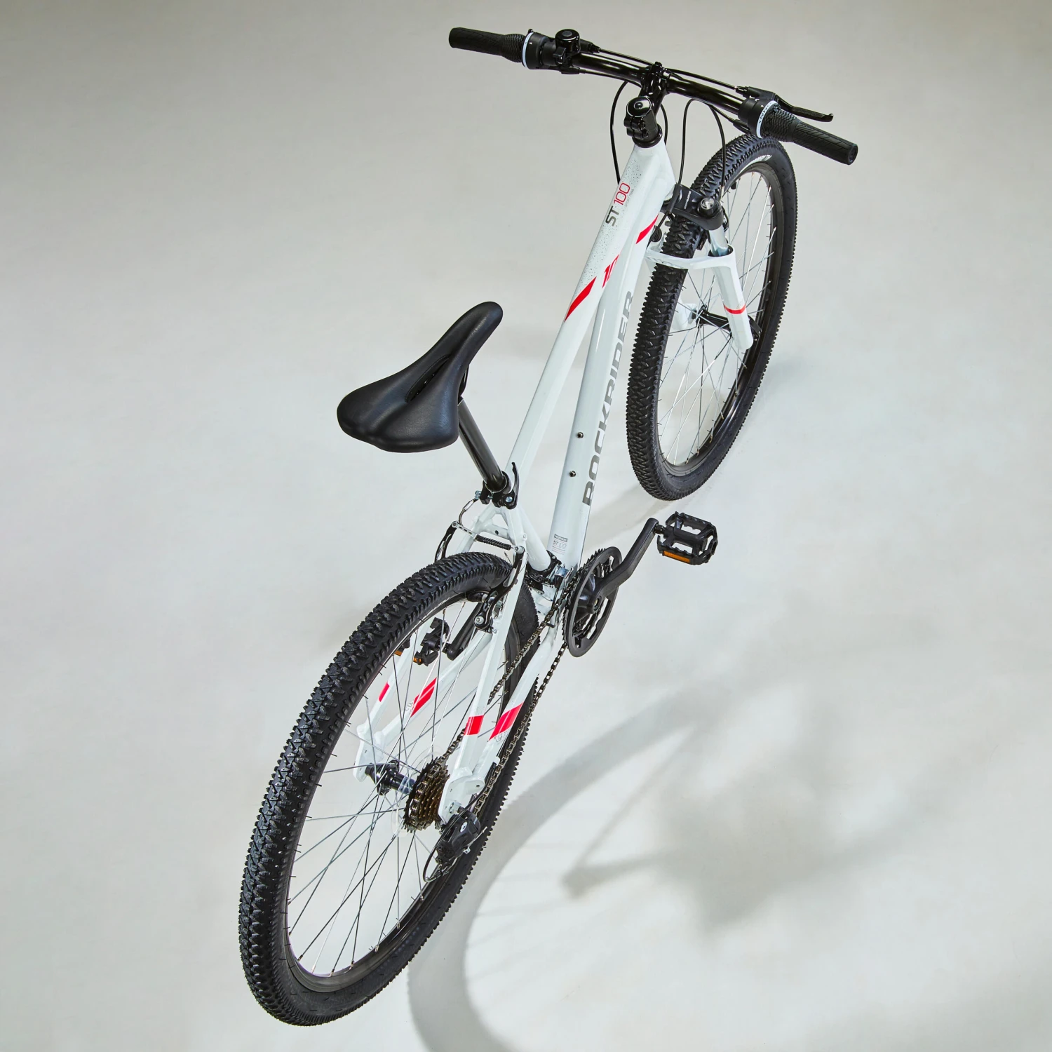 The Rockrider ST100 mountain bike comes with resin platform mountain bike pedals for added light weight and safety. If your foot slips off the pedal, there’s less risk of bruising your shin.