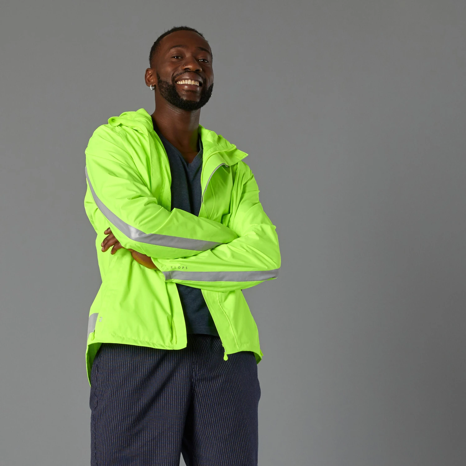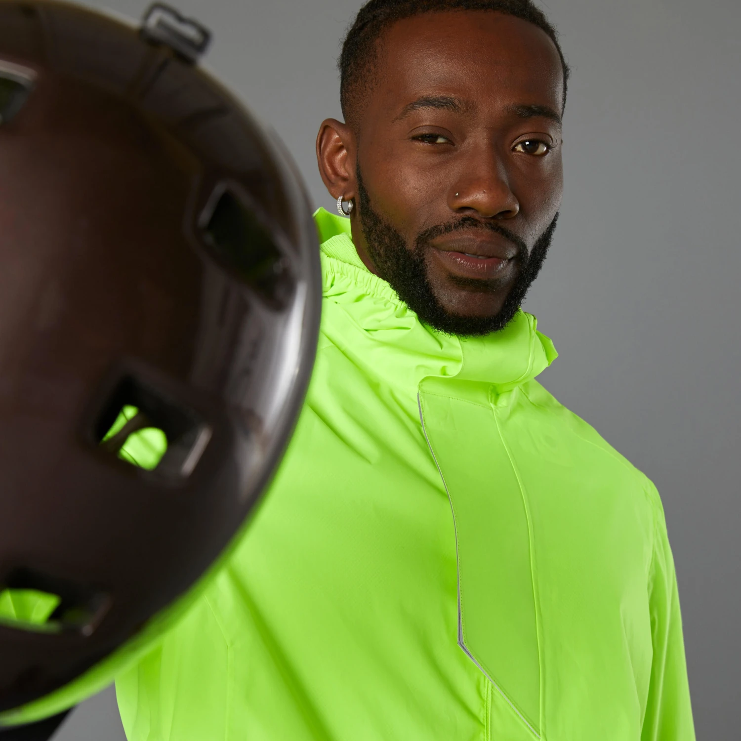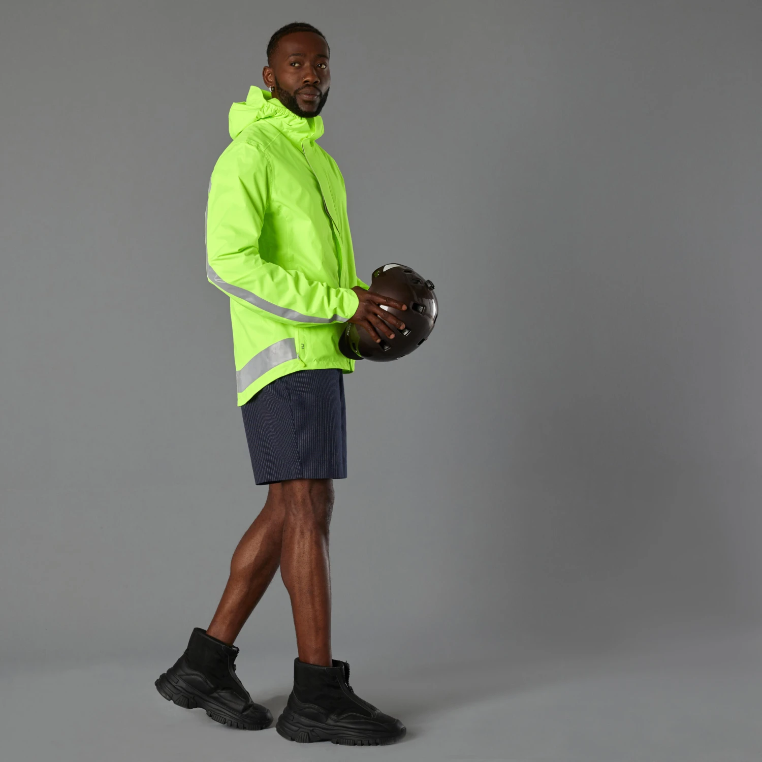Stay visible while protecting yourself from the wind and rain. With neon colours and reflective strips, this jacket is designed to be seen both day and night.Stand out from any angle. This waterproof cycling jacket is EN 1150 certified for day and night visibility. The hood can go over or under your helmet.