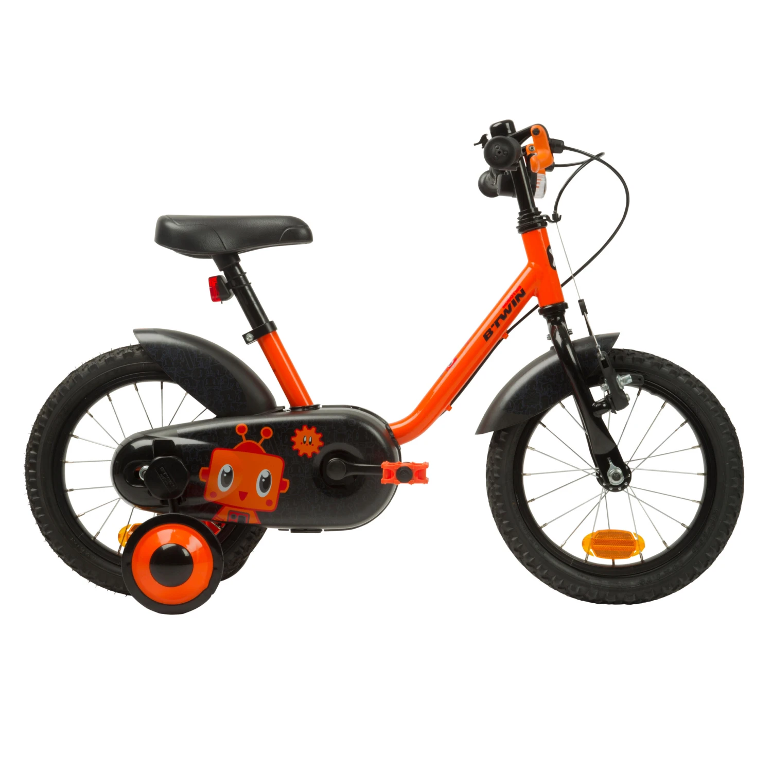 1, 2, 3, pedal! This 14″ kids’ bike is designed to ease children aged 3 to 4.5 into the world of cycling. It’s suitable for kids measuring from 90 to 105 cm.This young kids’ bike comes equipped with stabilisers, which can be removed without tools when your child is ready to cycle without them. It includes a chain guard and specialised brakes for kids.