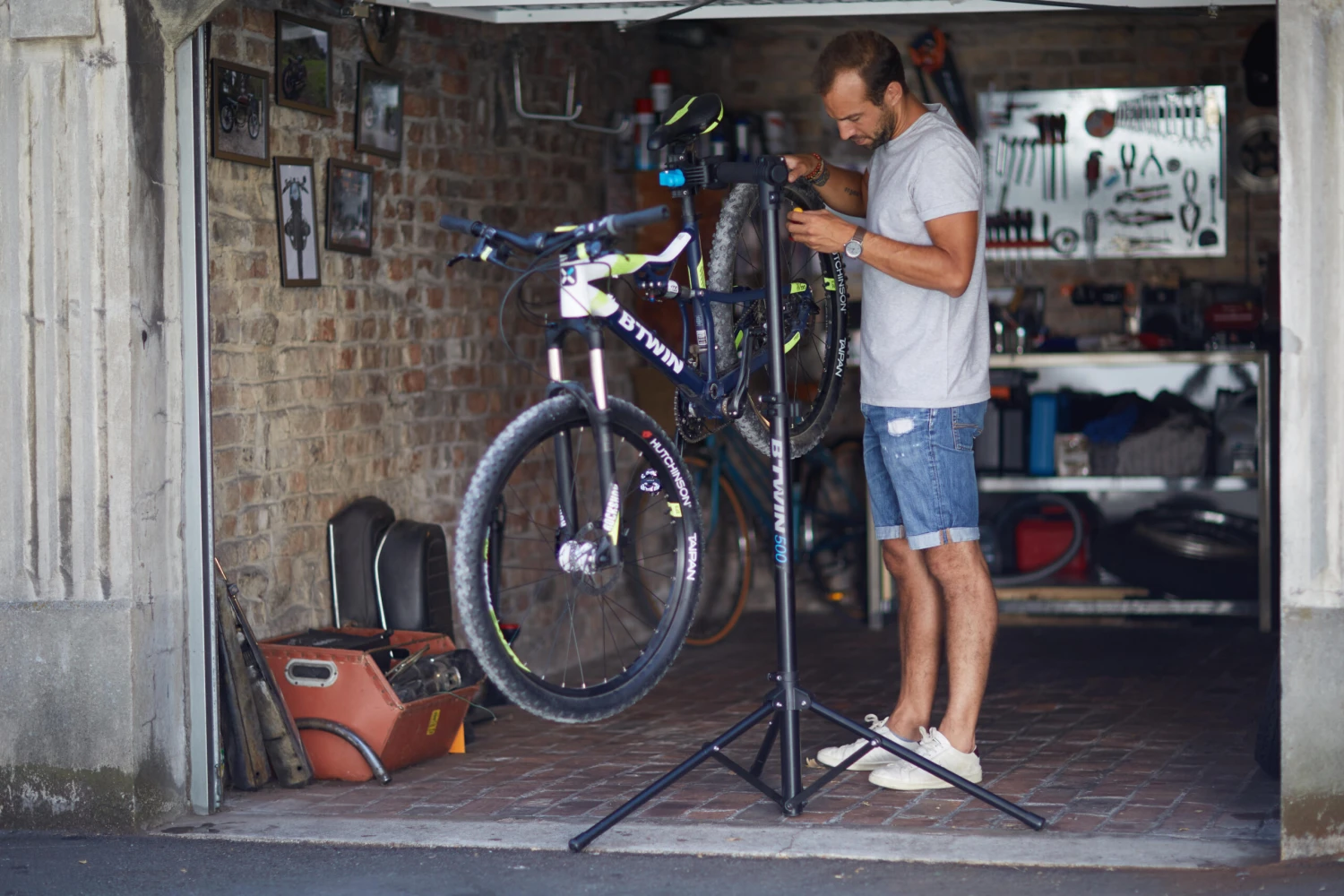 For greater comfort when cleaning or repairing your bike, we recommend clamping it so that the rear wheel is higher than the front wheel. This will keep the handlebars level.