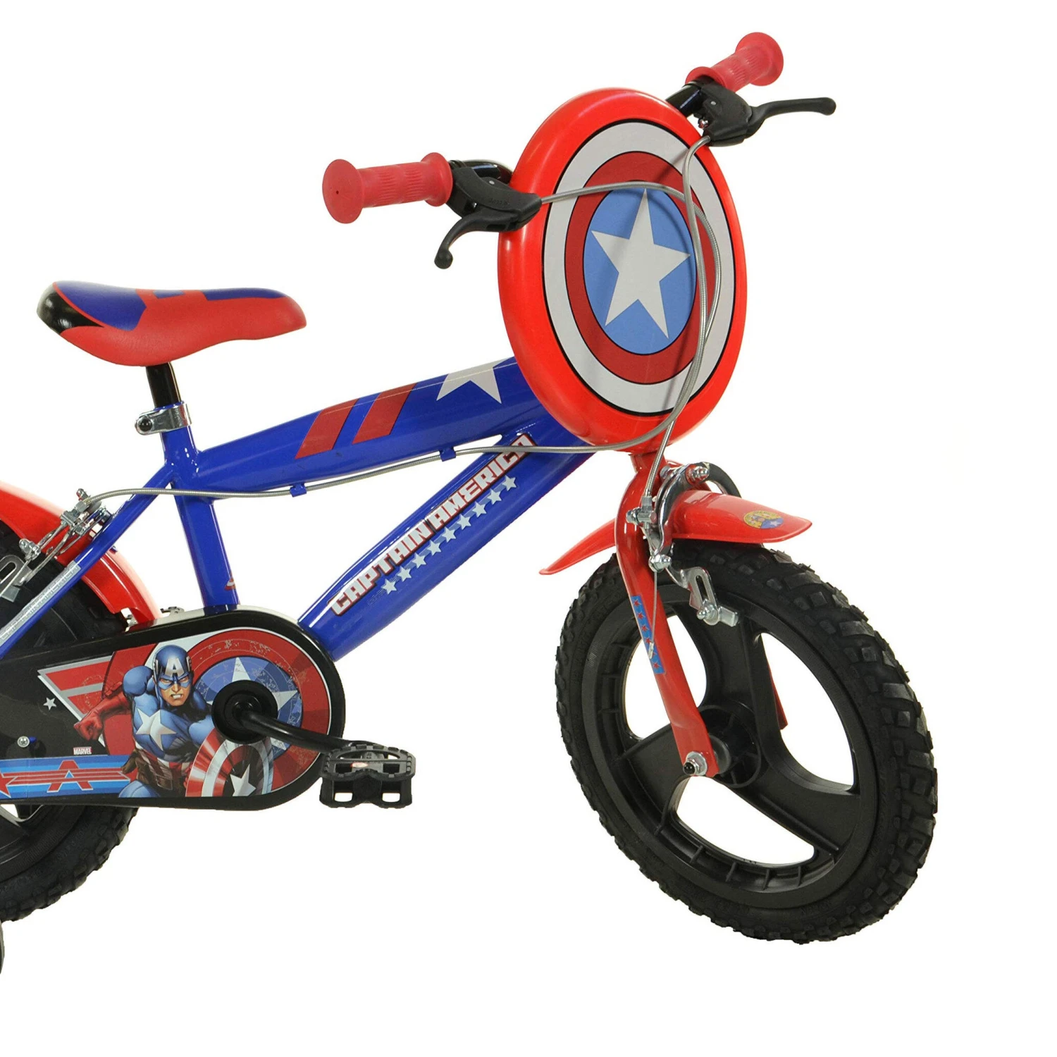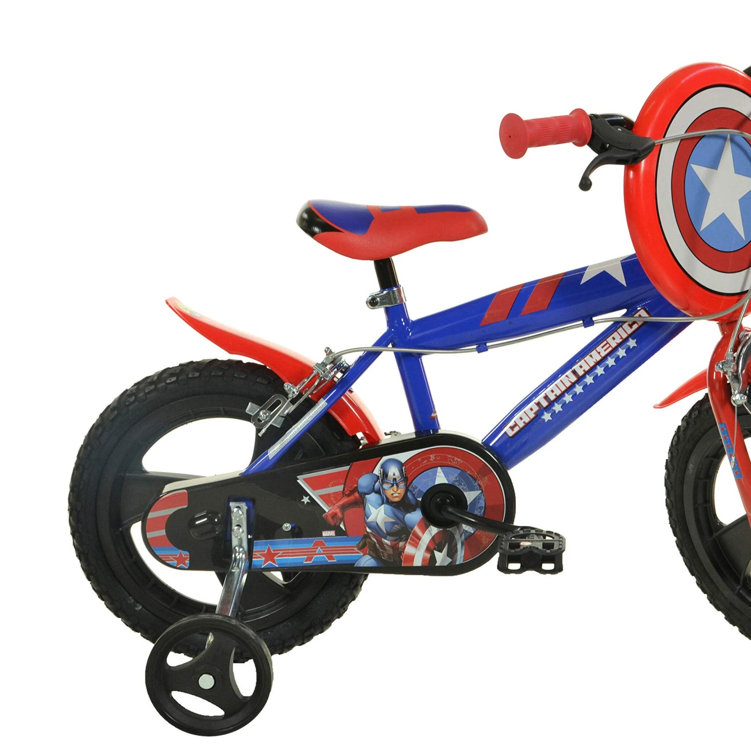 This Captain America Licensed Bicycle comes with front and rear brakes, freewheeling rear wheel, pneumatic tyres with MAG wheels and mudguards and also comes with removable stabilisers. The 14″ Captain America bike also comes with a padded adjustable saddle and adjustable handlebars and also comes with front and rear Captain America front shield. This 14″ bike has Captain America decals.