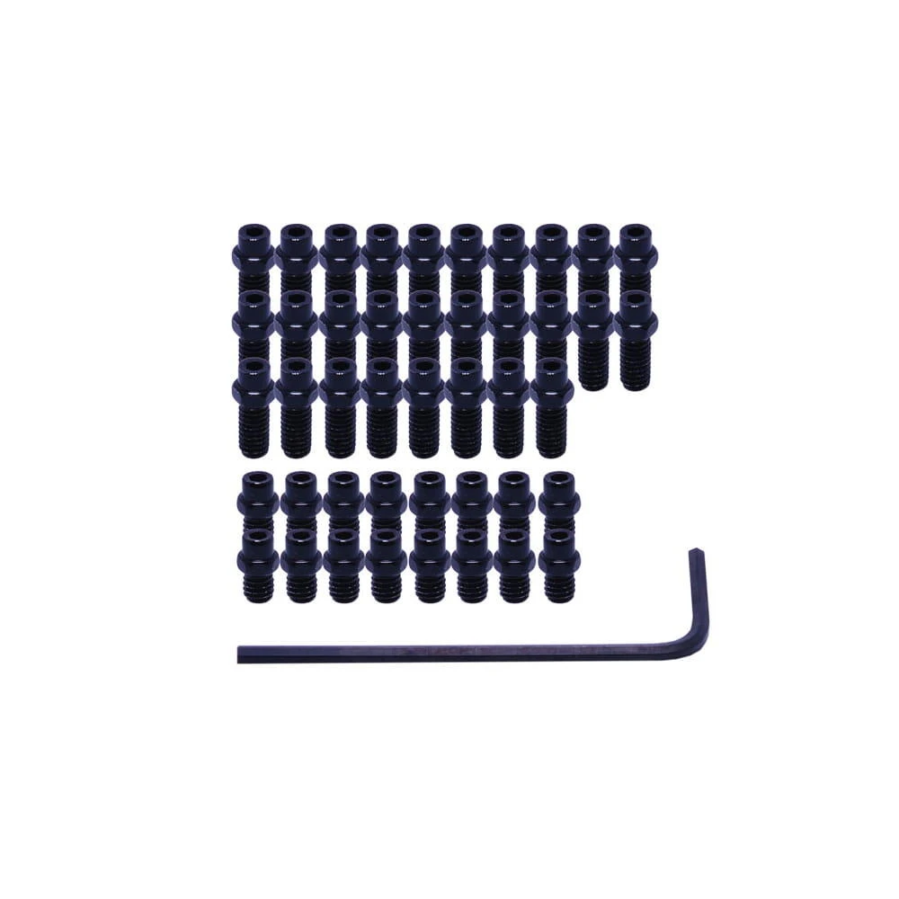 28 x long pins (for use in the outside edge of your pedals) overall length 12.5mm, thread is M4x0.7×8, stud is 4.5mm using either a 5mm spanner or 2mm allen Wrench to secure.