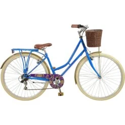 The timeless Elegance heritage bike from Elswick has been designed with a beautiful 17″ easy step-through frame giving it a leisurely yet responsive ride. The Elegance features easy to use, reliable 6 speed gearing that is operated via a twist grip shifter, all of which is made by globalled renowned components maker, Shimano. The wicker effect basket is durable and waterproof (unlike wood based alternatives) and is ideal for transporting shopping (or pets!) and adds a sense of continental class. The frame is finished in striking dark green with contrasting fuschia finished front and rear full-length metal mudguards, as well as the matching full length chain guard providing protection from the chain. The 700C smooth-rolling cream coloured tyres complement the satin alloy wheel rims & chrome seat-post,handlebar and stem. Reliable braking is provided courtesy of the front and rear aluminium V-brakes which supply controlled braking power through the reach-adjustable brake levers. As we know comfort is important to you, a wide Elswick leather effect comfort saddle is supplied as standard with complementing ergonomic soft-touch grips. The Elswick Elegance is a beautiful bike, with it’s own sense of personality and style, putting a fresh look to this timeless bike style. The charm of Elswick shines through by mixing old with new, to create a great bike to be seen around town on. Upgrades over the Elswick Royal if you hadn’t spotted them are the 6 speed gears, and front basket. Suitable for cyclists with an approximate inside leg measurement of 68-85 cms/27-33″.