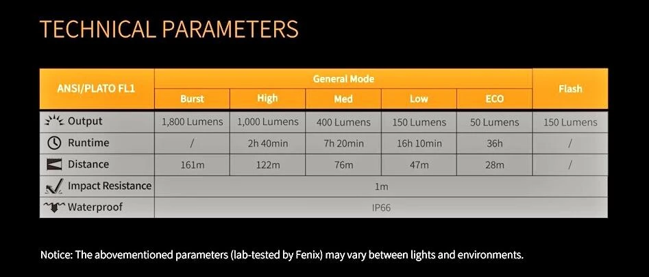 - High – 1000 lumens (2 hrs 40 min total) – 122m beam