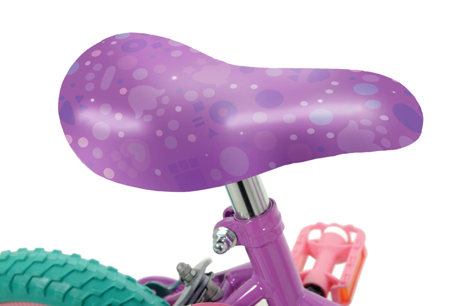 The perfect first big bike for any Gabbys Dollhouse fan, with colourful character graphics, the 12″ bike comes complete with shaped plaque, stabilisers and durable steel frame. Stabilisers can be removed as core coordination, strength and skill improve. The 12″ puncture-proof EVA moulded wheels with mag wheel inner provide extra stability and the deep tread tyres offer a strong yet comfortable ride with excellent grip. Both saddle and handlebars are adjustable in height to suit children as they grow and gain in confidence and a soft saddle and hand grips provide additional comfort whilst learning. With safety in mind, the character printed chainguard is full enclosed while the front and rear caliper brakes provide efficient stopping.