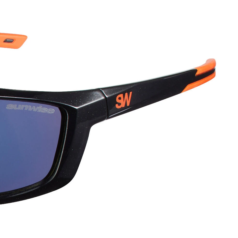Shiny metallic black frame with orange features. Gold platinum polycarbonate lenses.