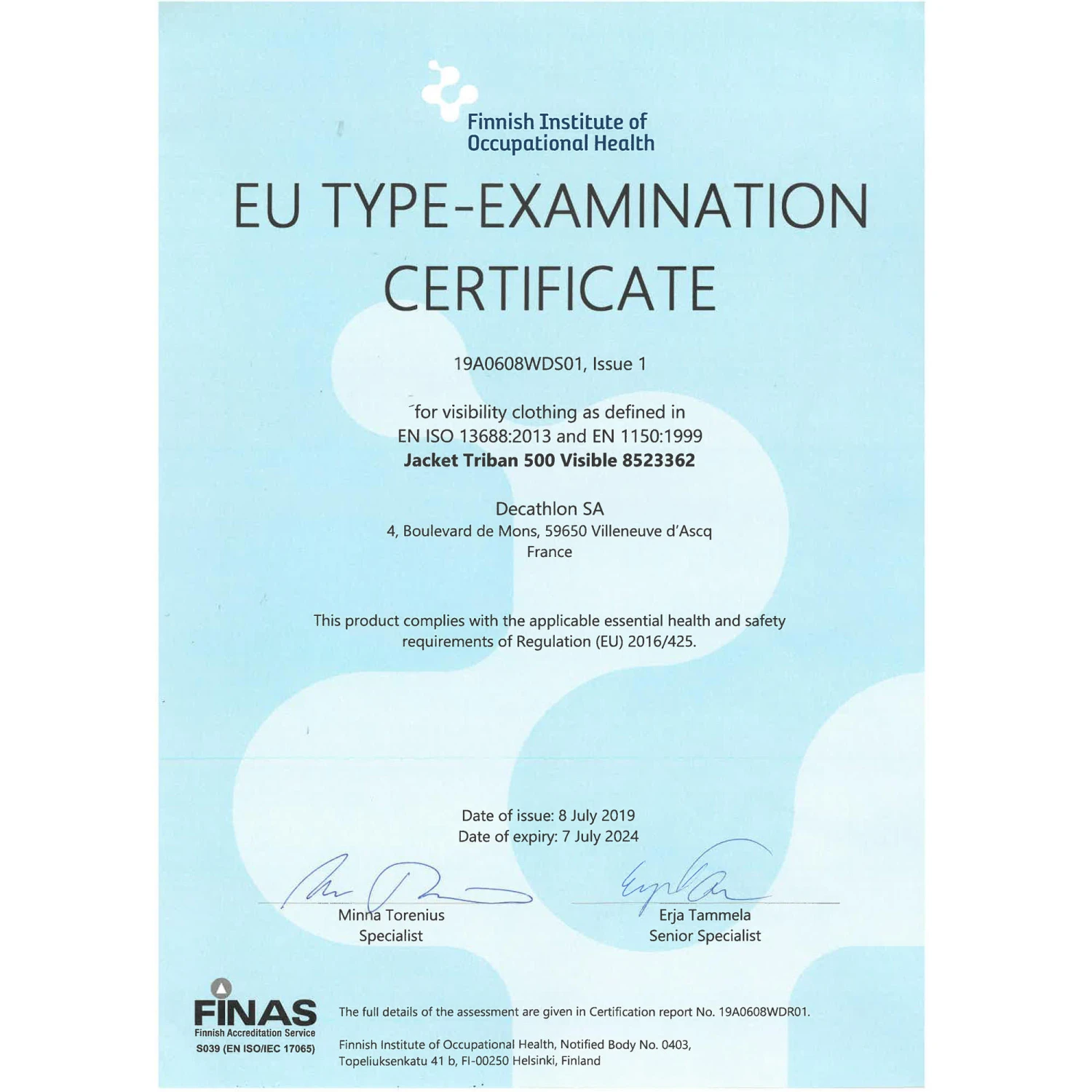 Hi-viz jacket (day and night, 360°), certified to standard EN1150.
