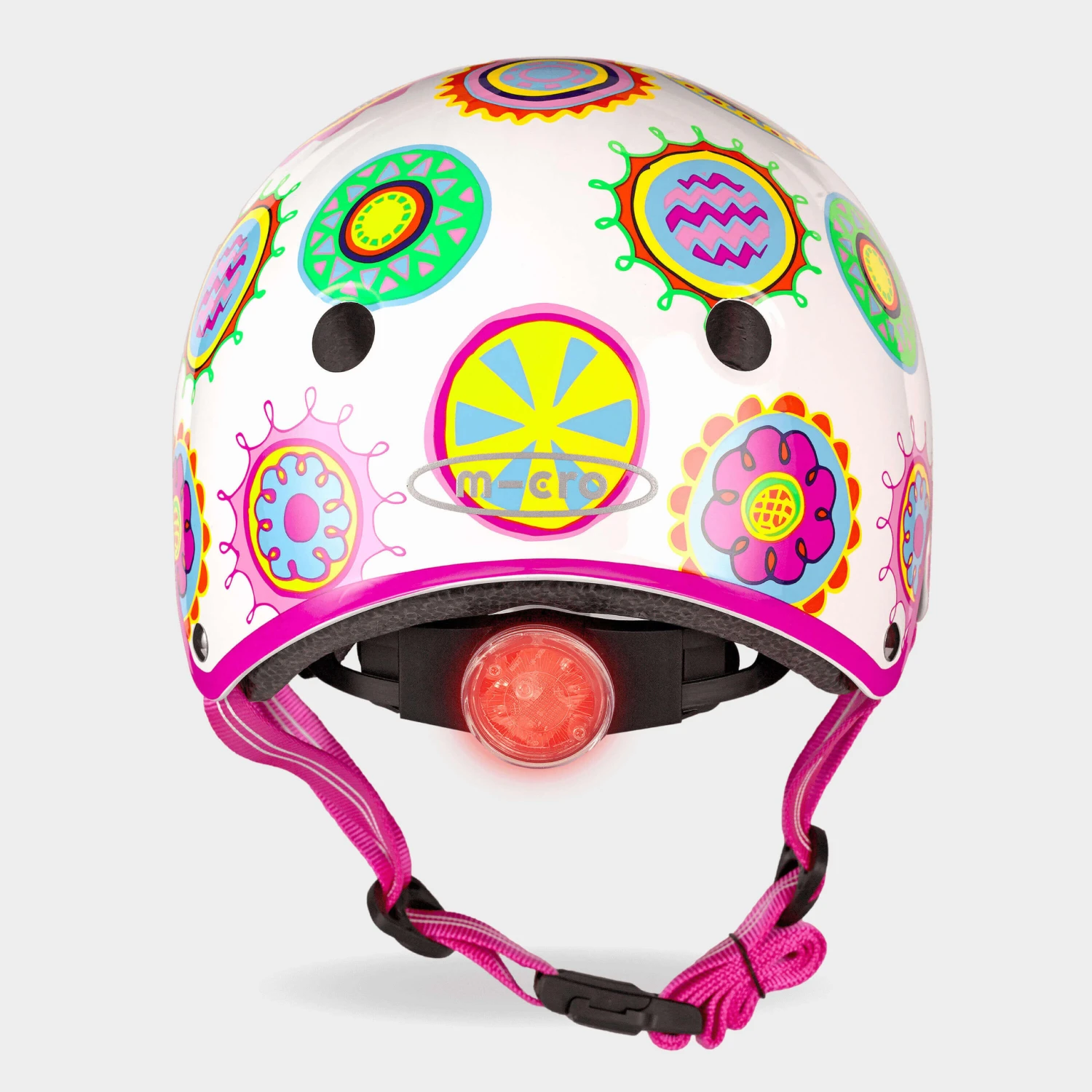 We believe every scooting adventure starts with scooting safely. And we believe fuss-free helmet wearing starts with good design. So our Deluxe helmets are packed with the latest technology to make safe simple. Our magnetic buckle stops accidental pinching and helps little fingers fasten their helmet independently. Our adjustable side sliders enable a snug yet comfortable fit. And our integrated light – which cleverly doubles as a sizing dial – ensures children are visible when out and about. Complete with stylish prints, luxurious inner padding and our worry-free Micro guarantee. Happy heads wear Micro helmets. This helmet has been tested and approved according to European Norm (EN) 1078:2012+A1:2012. It conforms with regulation (EU) 2016/425. For safe, happy scooting, cycling and skating adventures. Weight; 390g ( Small) 405g ( Medium)