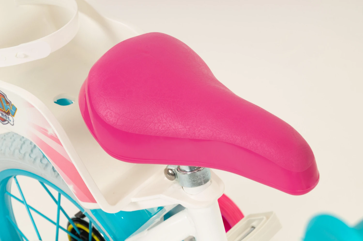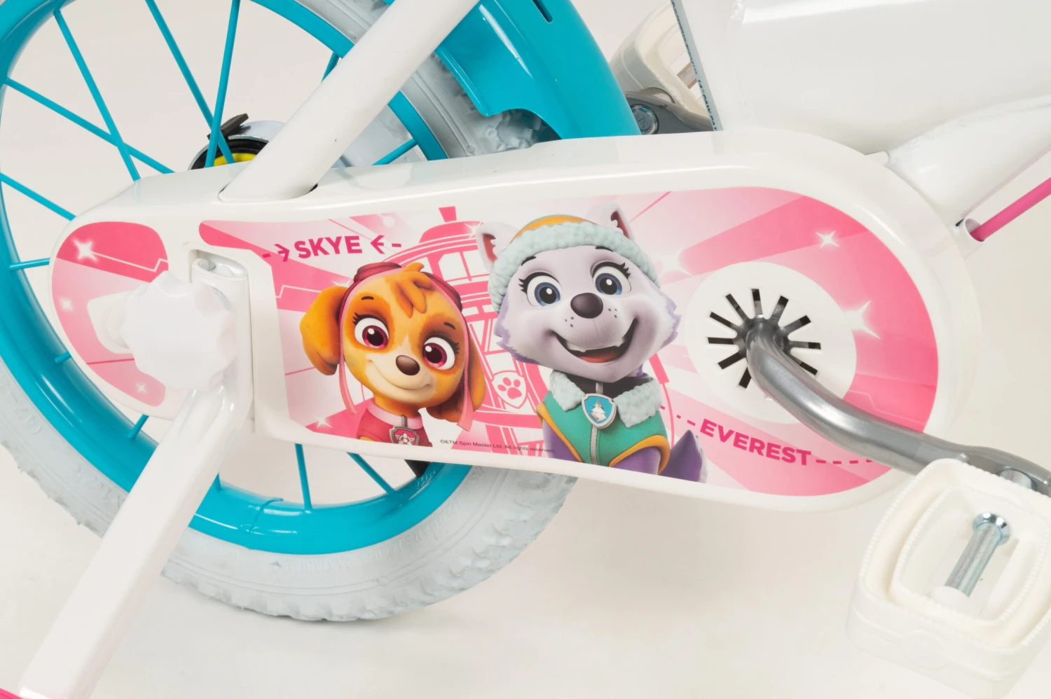 This freewheeling white Paw Patrol licensed 14″ bicycle comes with a front calliper brake and a rear drum brake. it features pneumatic tyres with spoked wheels with mudguards and also has removable stabilisers. The 14″ Paw Patrol bicycle also comes with an adjustable saddle and handlebars and also comes with a rear doll carrier with strap, a front basket and colourful Paw Patrol decals. Suits ages 4 – 6 years. Child height range 100 – 110 cm.