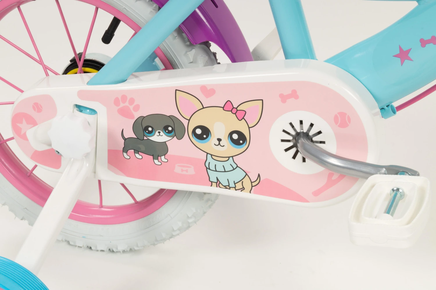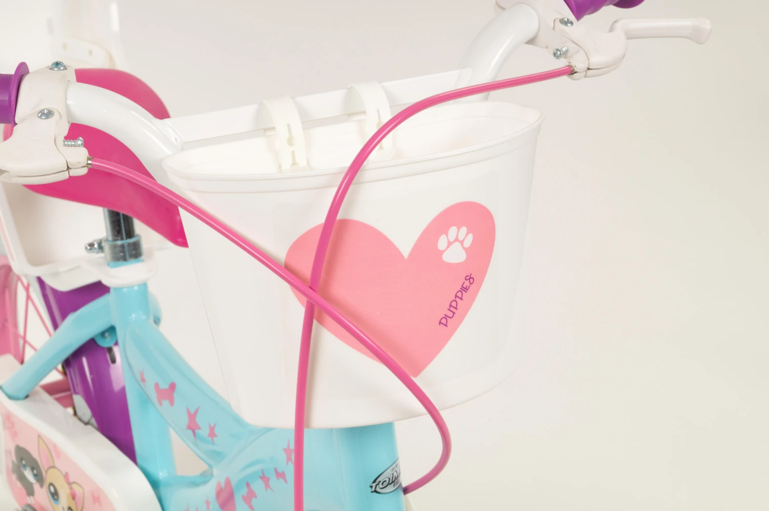 This colourful freewheeling Pets themed 14″ bicycle comes with a front calliper brake and a rear drum brake. it features pneumatic tyres with spoked wheels and mudguards and also has removable stabilisers. This 14″ bicycle also comes with an adjustable saddle and handlebars and also comes with a rear doll carrier with strap, a front basket and colourful Pet decals. Suits ages 4 – 6 years. Child height range 100 – 110 cm.