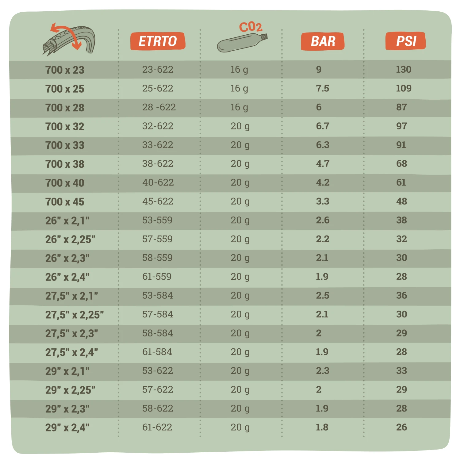 A 20g CO2 cartridge to attain the following pressures depending on the type of tyre: