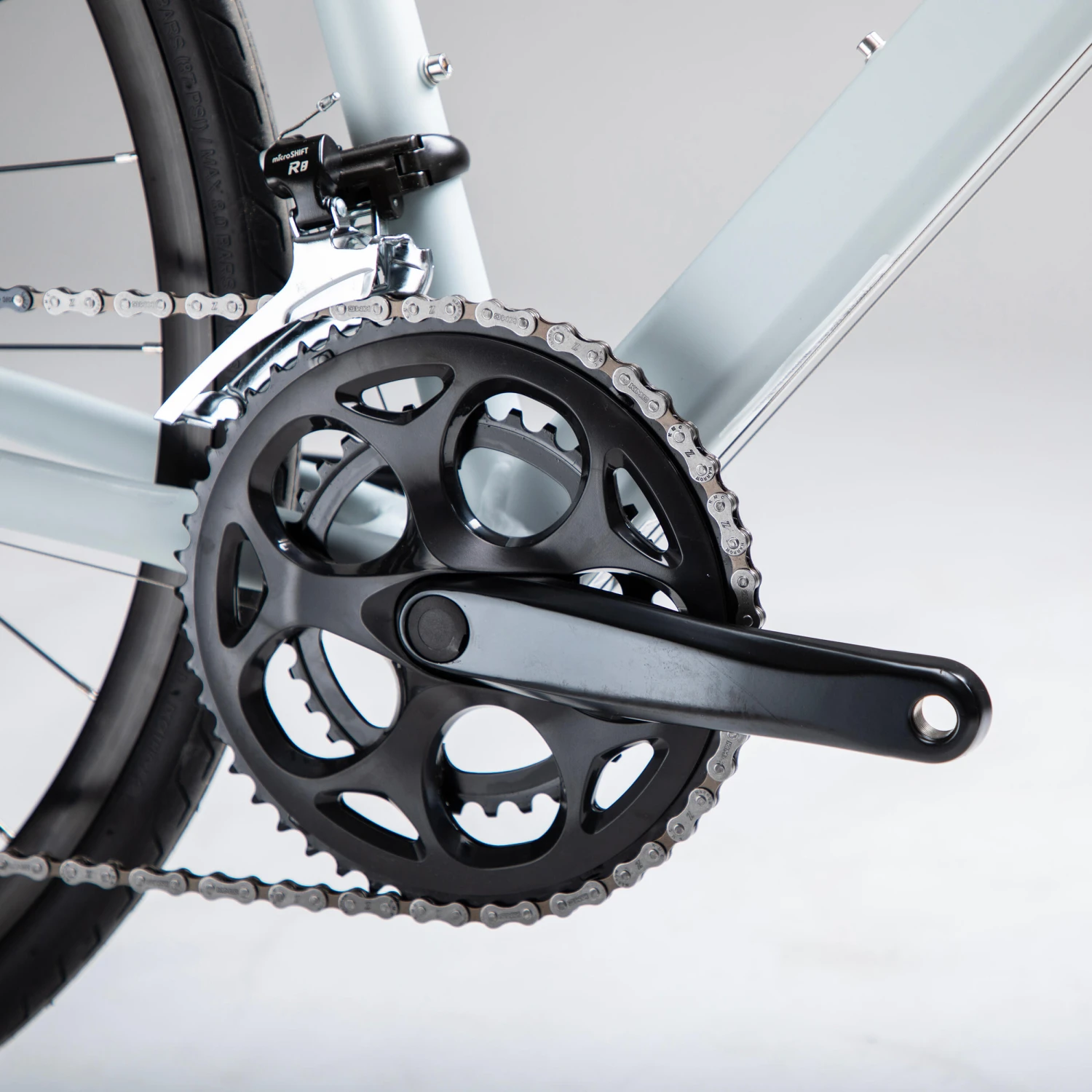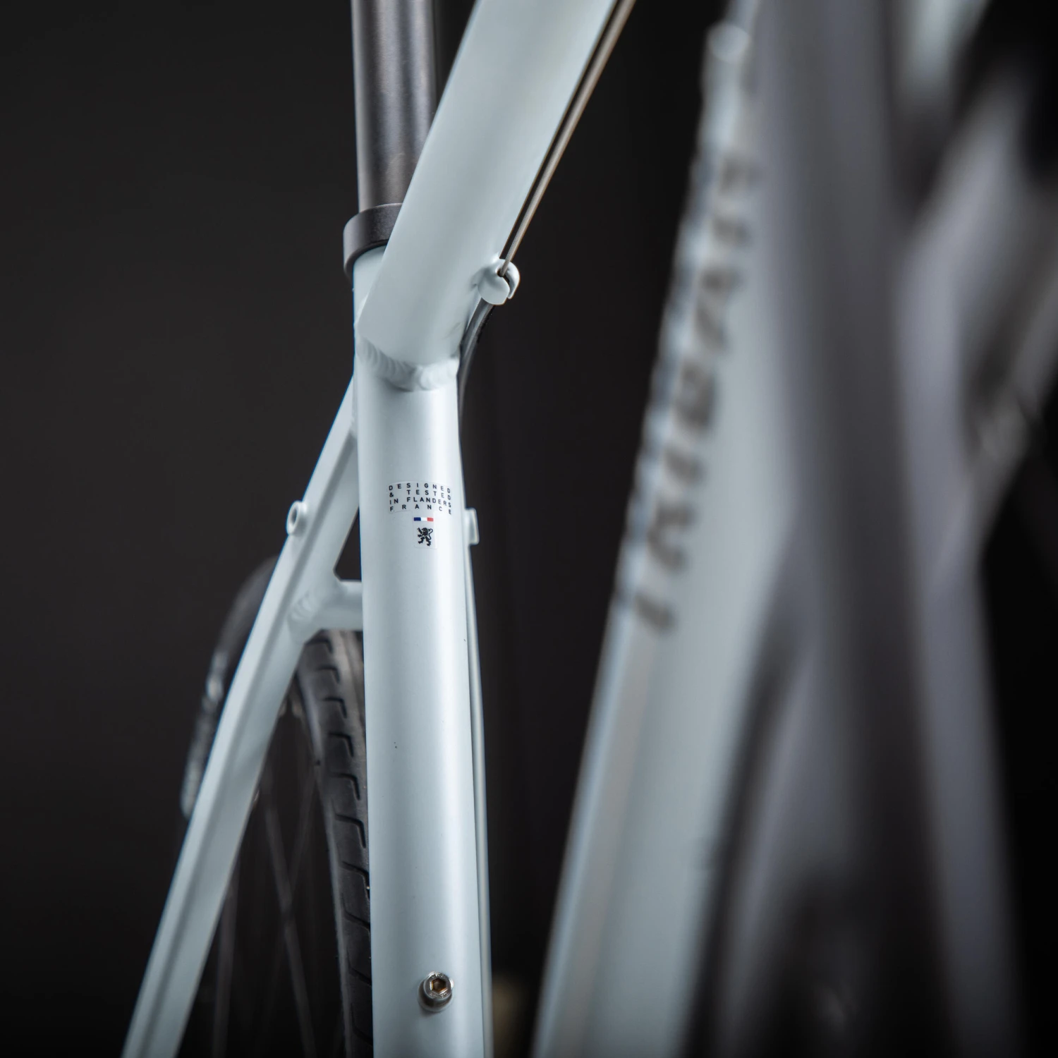 Comfort-oriented frame geometry with a higher steering socket and a shorter top tube that offers a more upright position than a classic road frame.