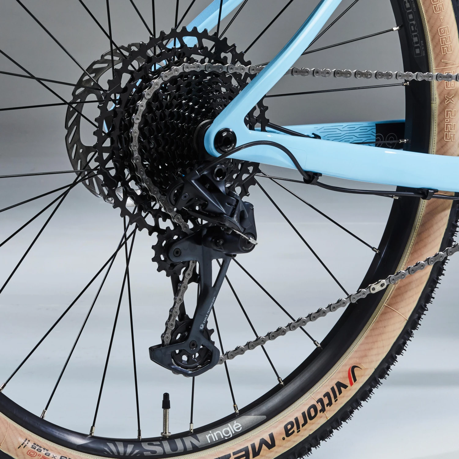 This mountain bike is designed for improving in cross country riding (XC).A semi-rigid full carbon mountain bike with internal routing!