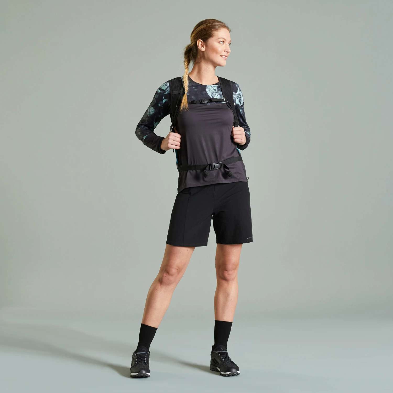 This women’s long-sleeved jersey is designed for warm weather or mid-season mountain bike rides lasting up to 4 hours.Regular fit.This comfortable, lightweight, and breathable women’s mountain-biking jersey is made primarily of recycled material, with a practical pocket and cleaning cloth.