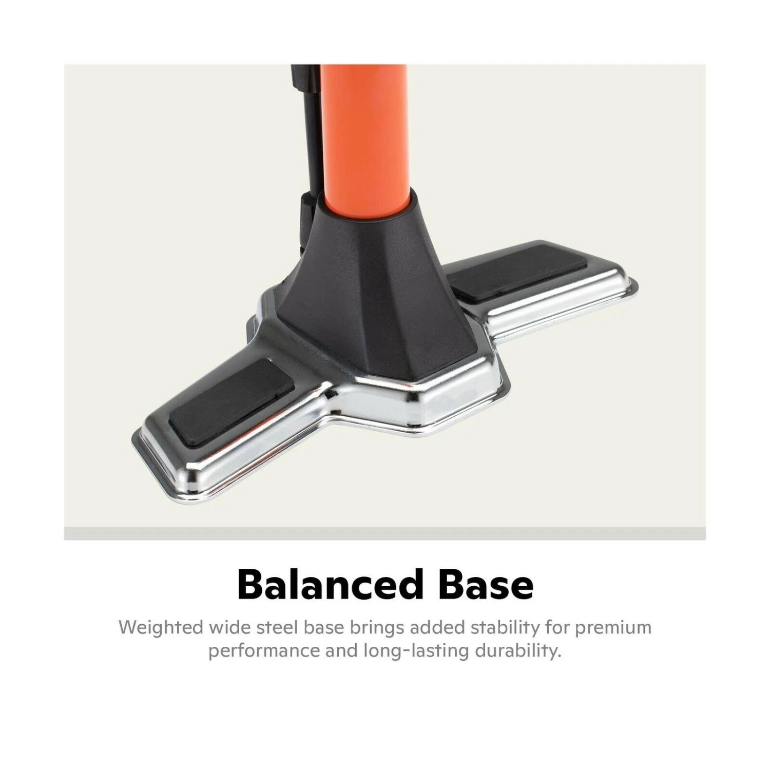 Wide steel base adds stability for easy pumping and adds long lasting durability; Base width measures 10.75 inches