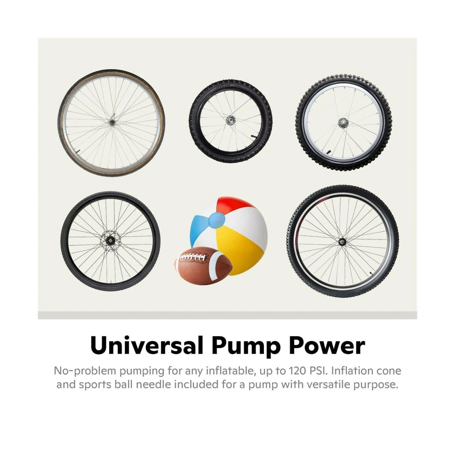 Air Center Plus: 120 PSI pump with gauge, comfortable grips, dual pump head for Shrader and Presta valves. Wide steel base, high-volume steel barrel, includes sports ball needle and inflation cone.
