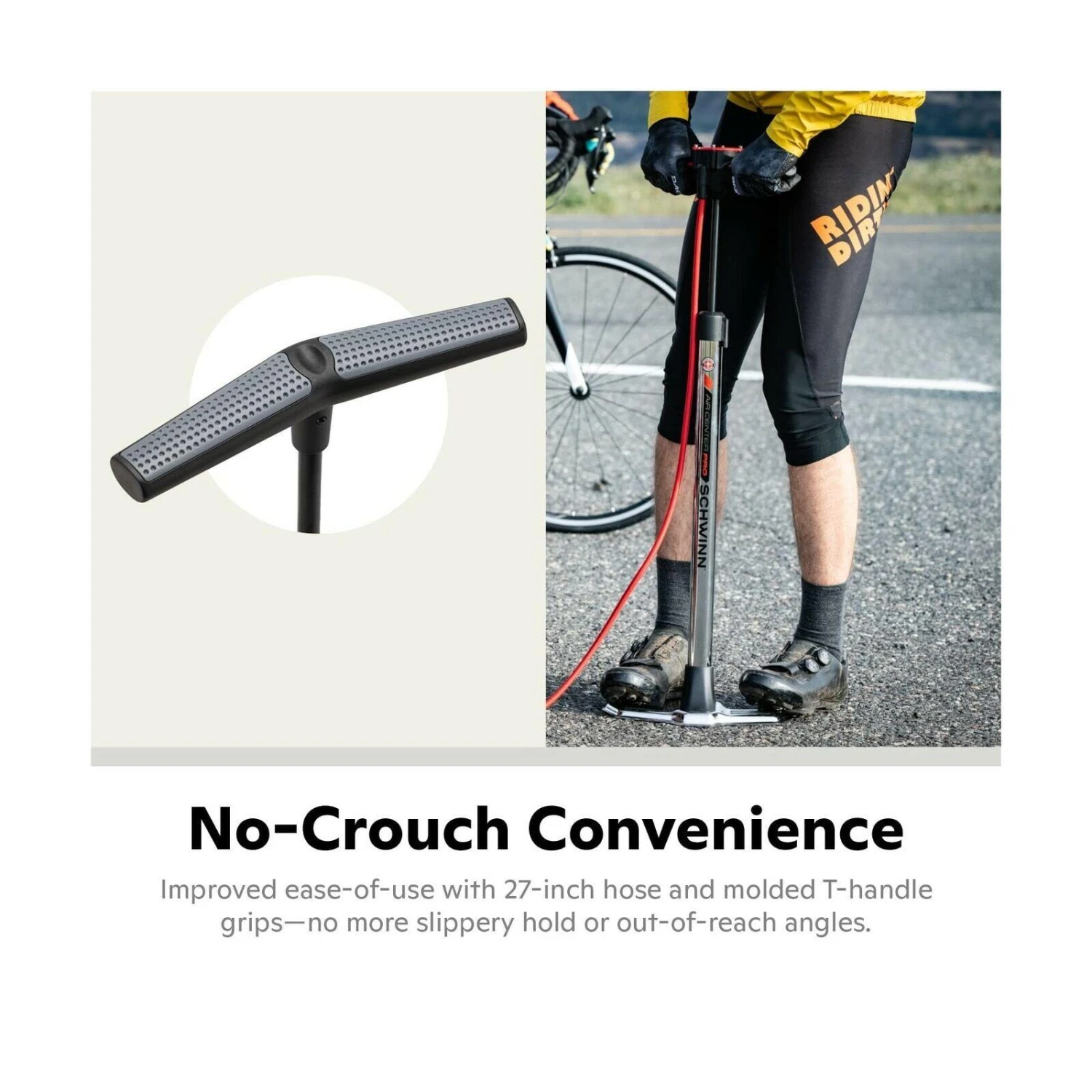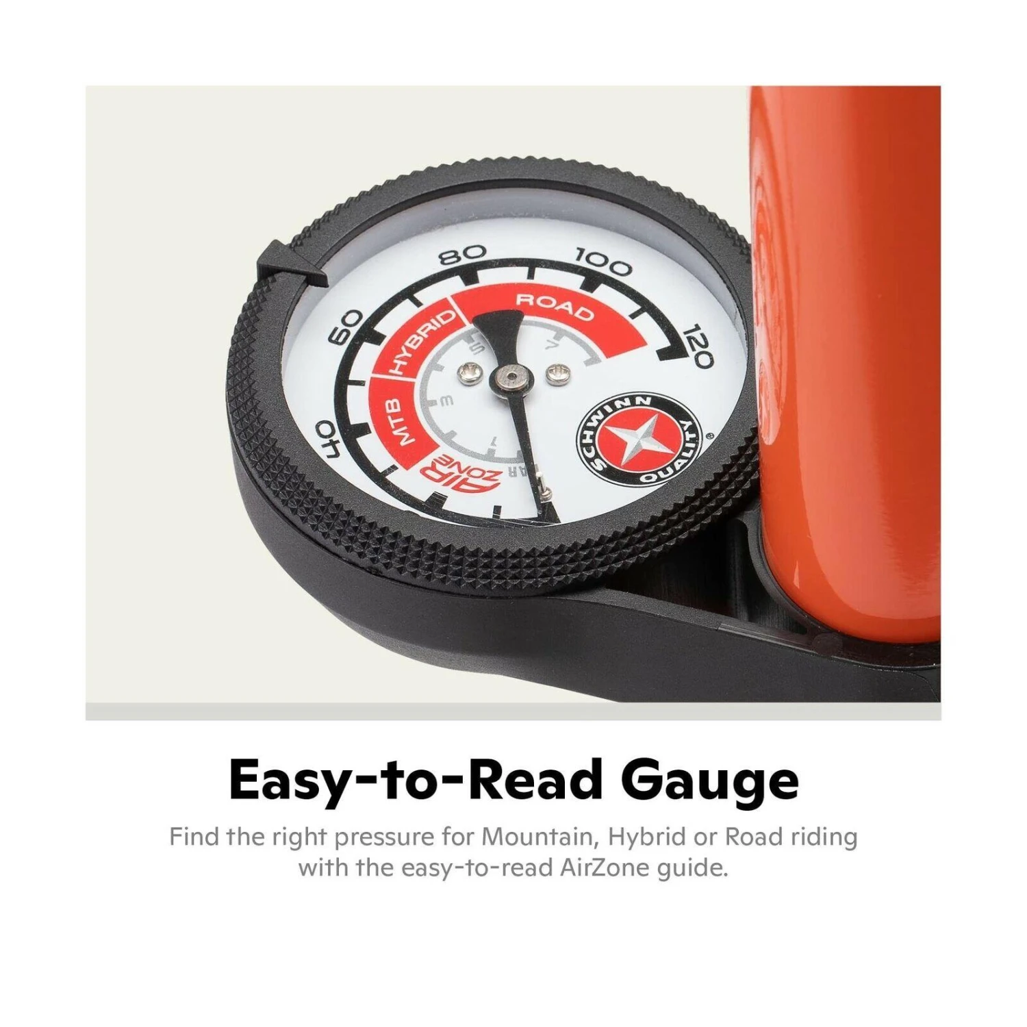 The Air Center pumps to 120 PSI with convenient mid barrel gauge; Co molded T handle grips make inflation comfortable; Includes a 26 inch rubber lined hose