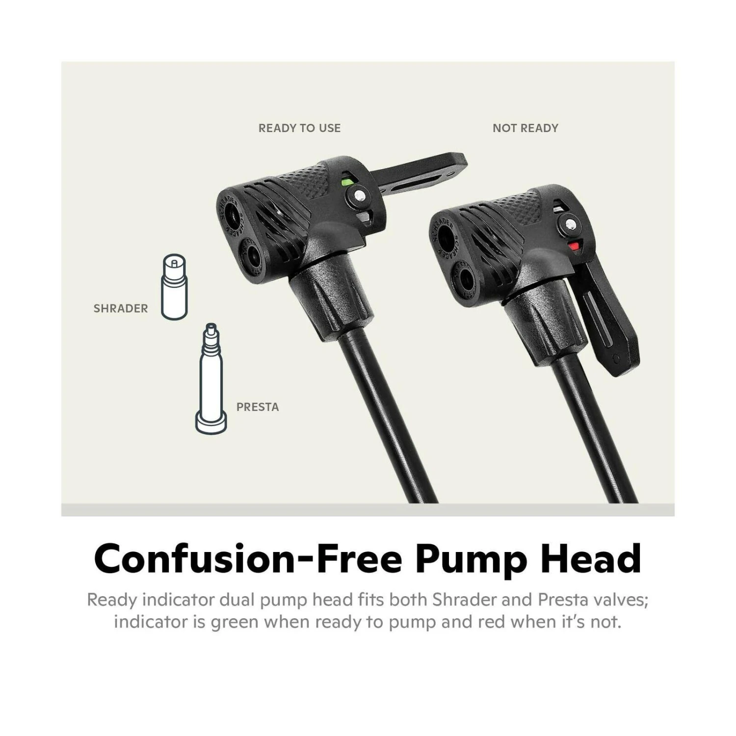 Dual easy indicator pump head fits both Shrader and Presta valves; indicator is green when locked and ready to use and red when it’s not