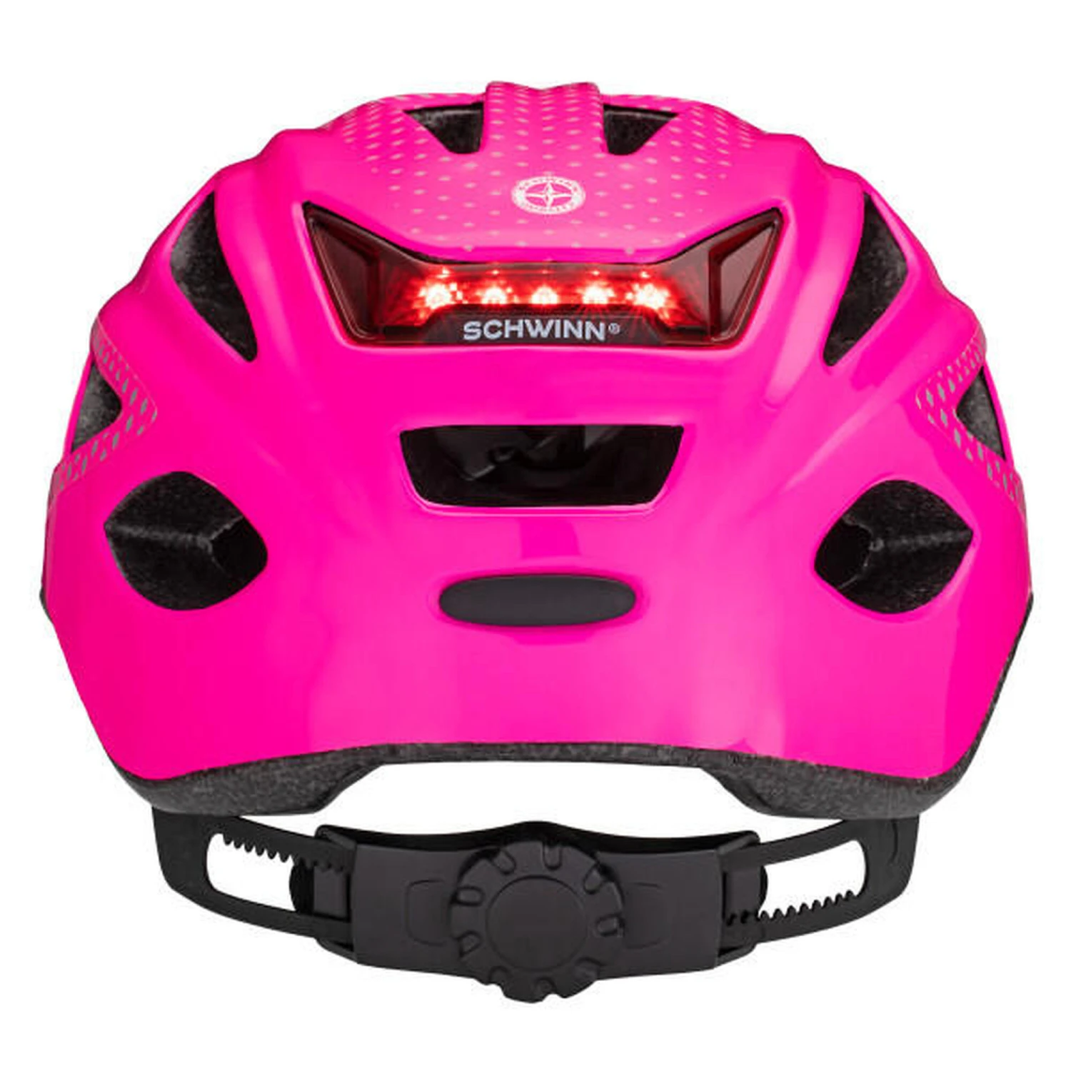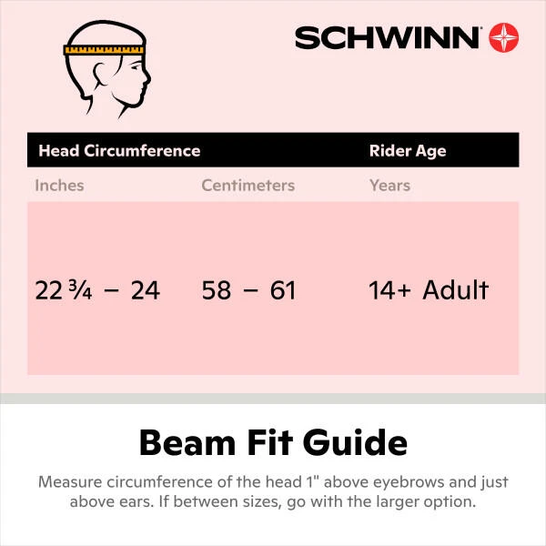 Light up the way with the Beam Lighted Reflective Adult Helmet from Schwinn, a new age helmet that’s as stylish as it is protective. The Beam’s calling card is the integrated rear light that shines a bright red beam to alert drivers and other riders of your presence at night. Not only is it a crucial safety feature, but it’s also a money saver that your wallet will appreciate. The light is conveniently removable for daytime riding or when it’s time to change the included batteries, and the top and sides are reflective to make you even more visible while you ride. The fit is always comfortable thanks to the adjustable dial fit knob that offers 360˚ adjustability, and you will feel cool as a cucumber thanks to the 18 deliberately placed air vents. As always, all Schwinn helmets are CE EN approved. Light up your ride with a safe, stylish and flashy helmet like the Beam. Enjoy the freedom of riding with Schwinn!