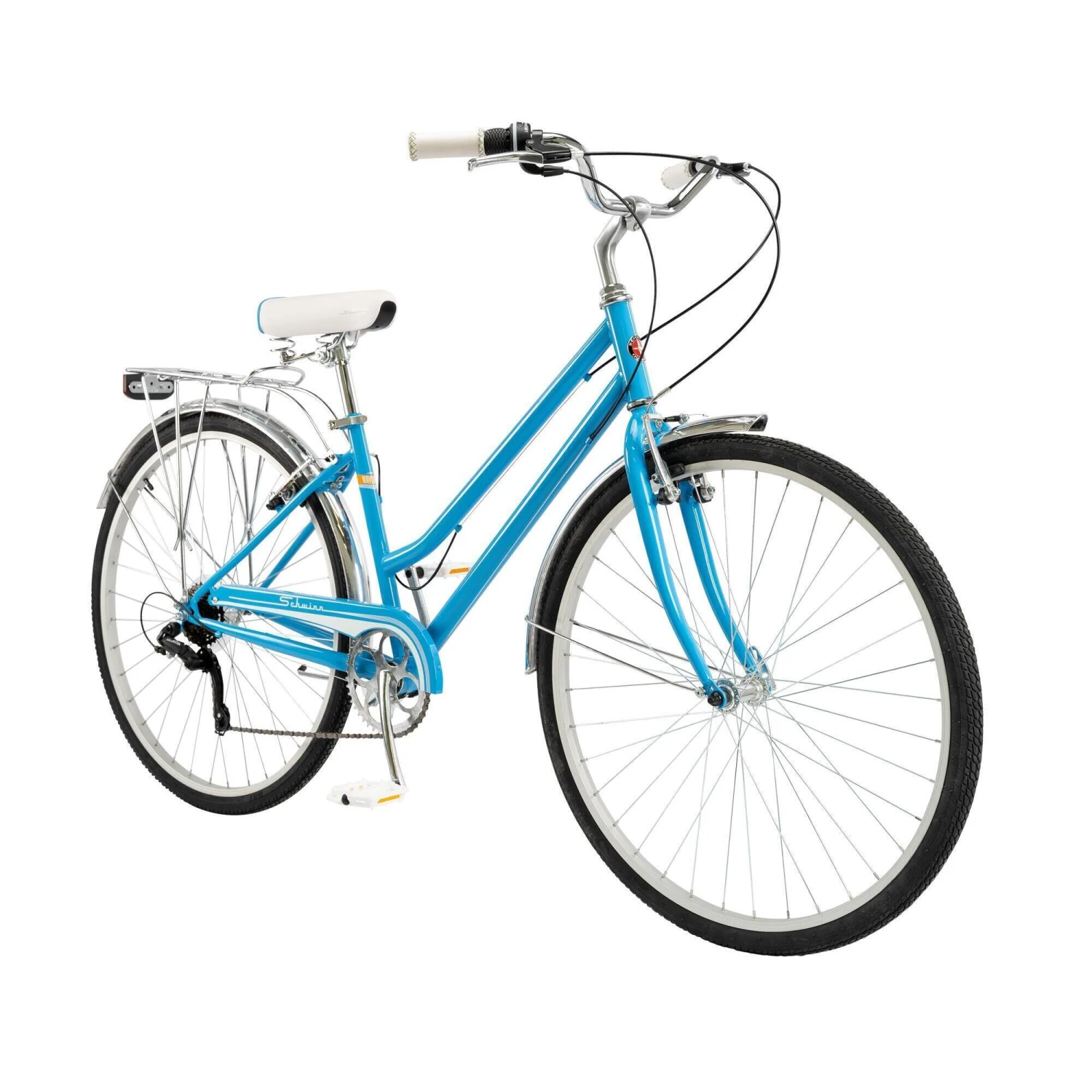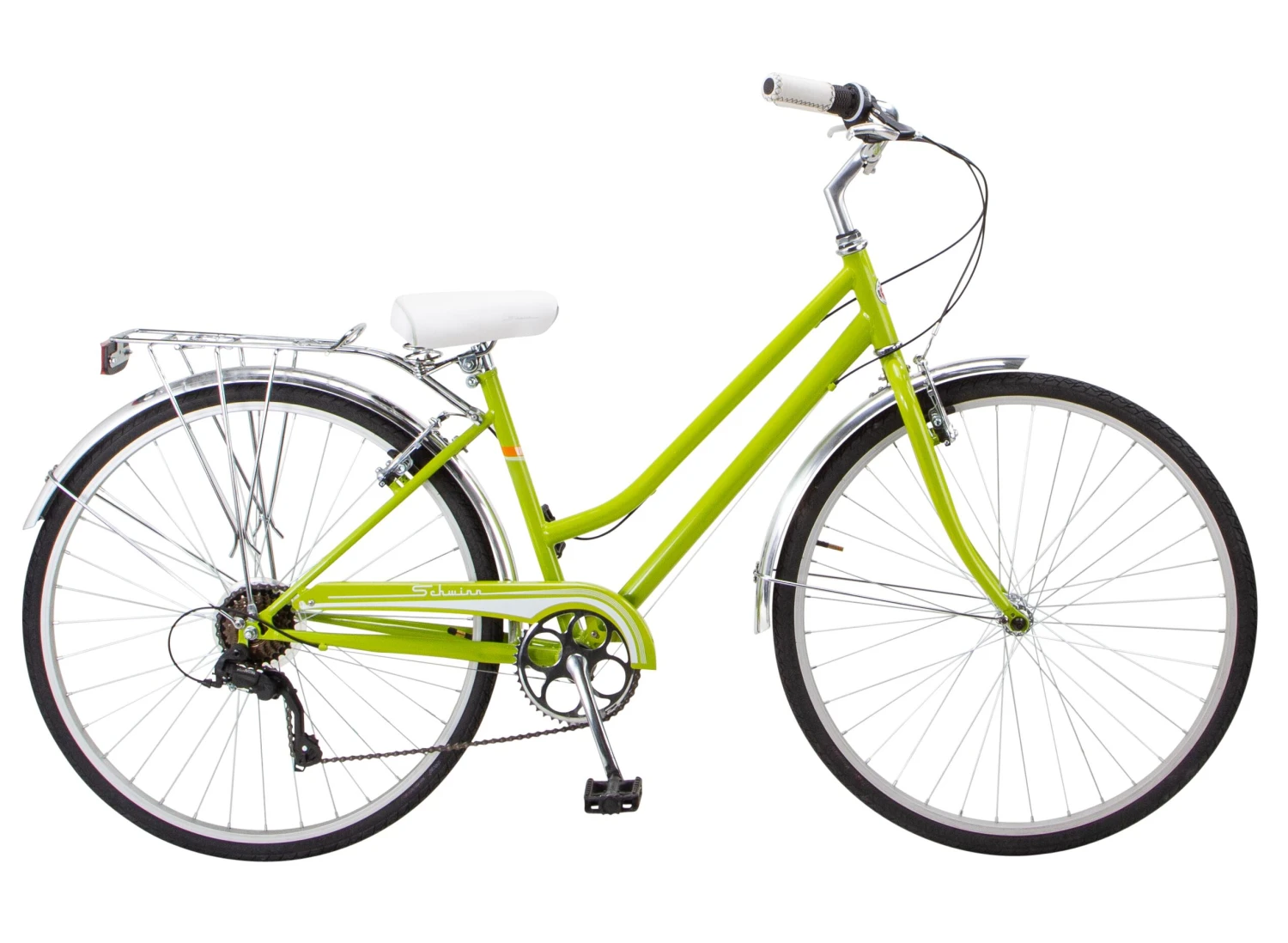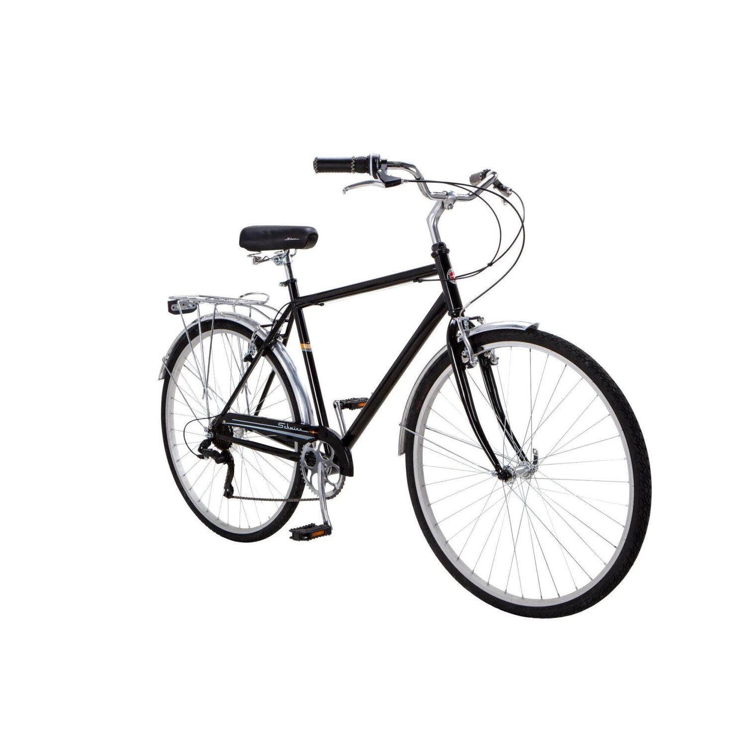 The Schwinn Wayfarer 700c Adult Hybrid bicycle is the perfect bike for cruising the city streets, bike path or beach promenade. Equipped with a Schwinn steel retro city frame and fork, you’ll turn heads as you cruise down your favourite streets and paths in vintage style. The swept-back handlebars offer a stylish and upright riding position that’s easier on your back, while the Shimano 7-speed rear derailleur with SRAM twist shift shifters will help you fly over pesky hill crests with ease. The alloy wheels are lightweight and strong, adding necessary durability without weighing you down. Linear pull brakes provide sure stopping power. Full fenders for an added touch of style and a rear carrier for convenient city rid
