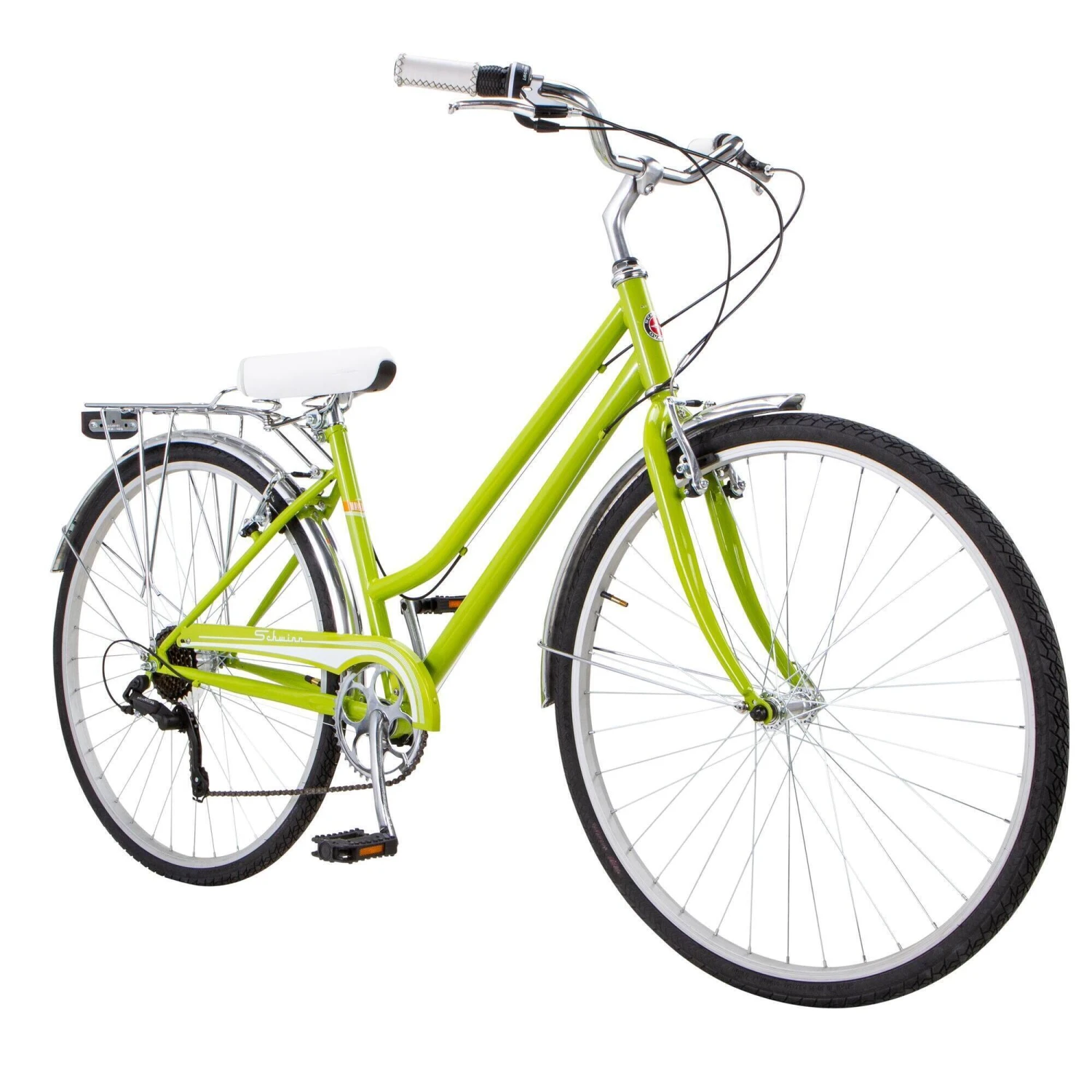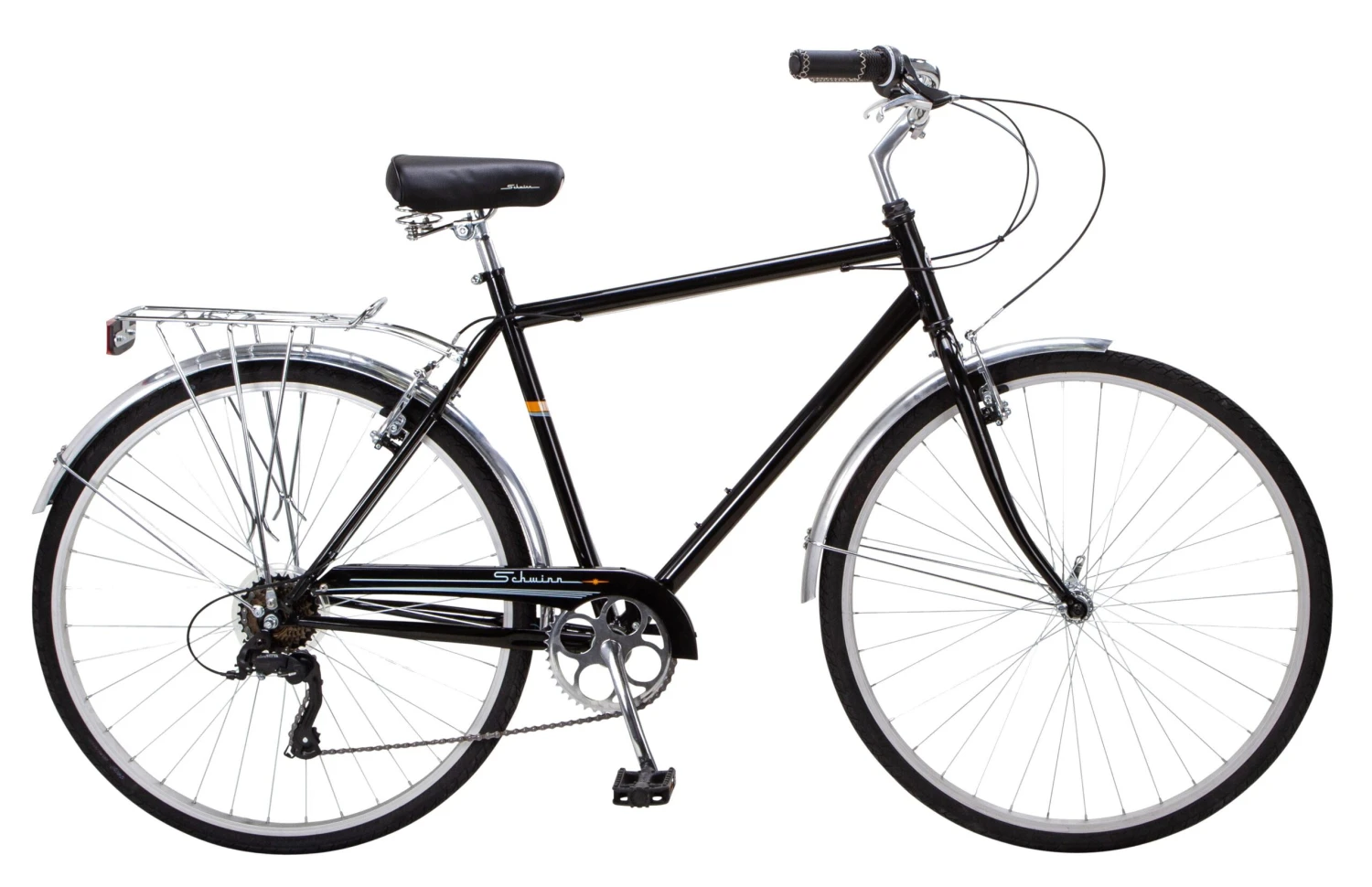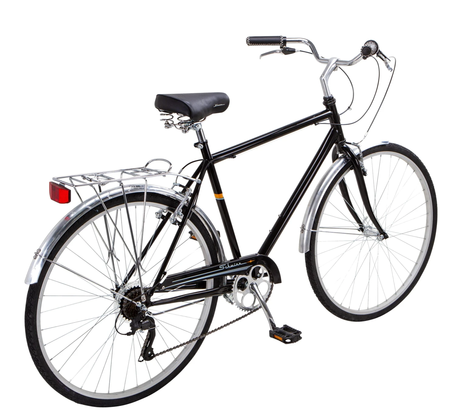 The Schwinn Wayfarer 700c Adult Hybrid bicycle is the perfect bike for cruising the city streets, bike path or beach promenade. Equipped with a Schwinn steel retro city frame and fork, you’ll turn heads as you cruise down your favourite streets and paths in vintage style. The swept-back handlebars offer a stylish and upright riding position that’s easier on your back, while the Shimano 7-speed rear derailleur with SRAM twist shift shifters will help you fly over pesky hill crests with ease. The alloy wheels are lightweight and strong, adding necessary durability without weighing you down. Linear pull brakes provide sure stopping power. Full fenders for an added touch of style and a rear carrier for convenient city rid