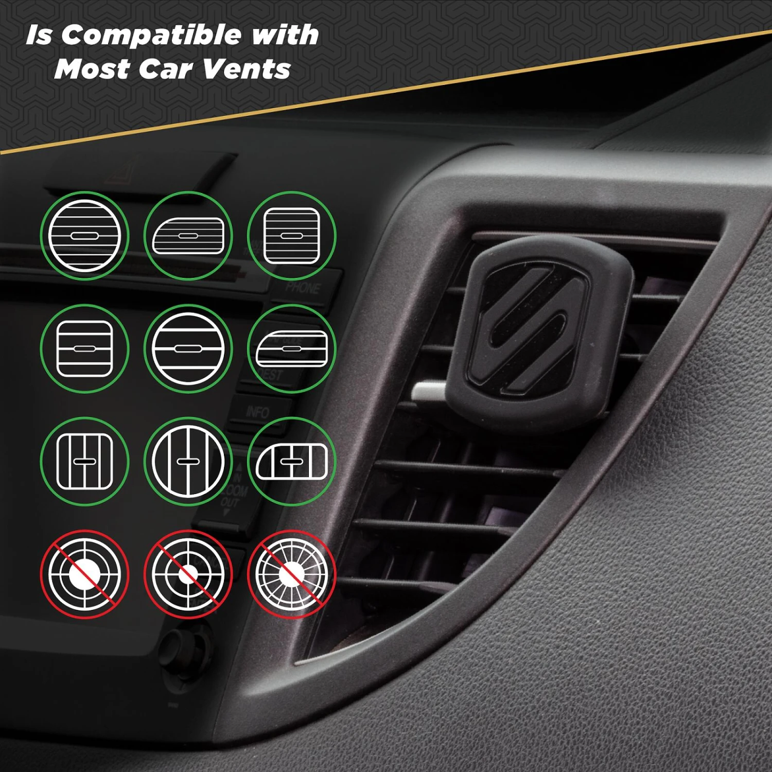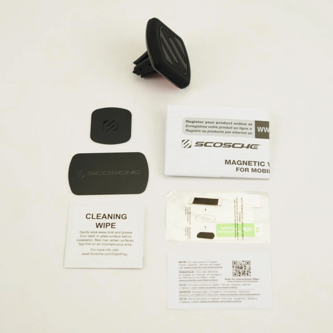 Quick, Convenient and Hands-Free; the MagicMount™ is a new magnetic mounting system for conveniently mounting your smartphone and devices to your vehicle’s vents for hands-free driving. Its cradle-free design eliminates the need to tighten around your device, just hover your device near the magnetic surface and it instantly locks securely in place. This convenient vent mount is the perfect solution for hands-free driving with your GPS or mobile device and attaches to both small and large sized louvers. Full wireless compatibility: with the proper MagicPlate™ placement on your iPhone, Android smartphone or other Qi-compatible devices without any interference with your existing wireless charger. The Scosche vent mount can be applied quickly in your vehicle and the magnetic connection allows you to rotate seamlessly between portrait and landscape orientation in a snap. You can also use this vent mount as a kickstand on tabletops, it’s great for air travel & nightstands!
