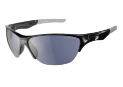 Shiny black frame with light grey features. Grey polycarbonate lenses.