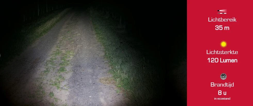Burn time: 2 h (power mode), 4 h (standard mode), 8 h (eco mode), 9 h (flashing), 9 (fast flashing), 10 h (SOS-flashing)