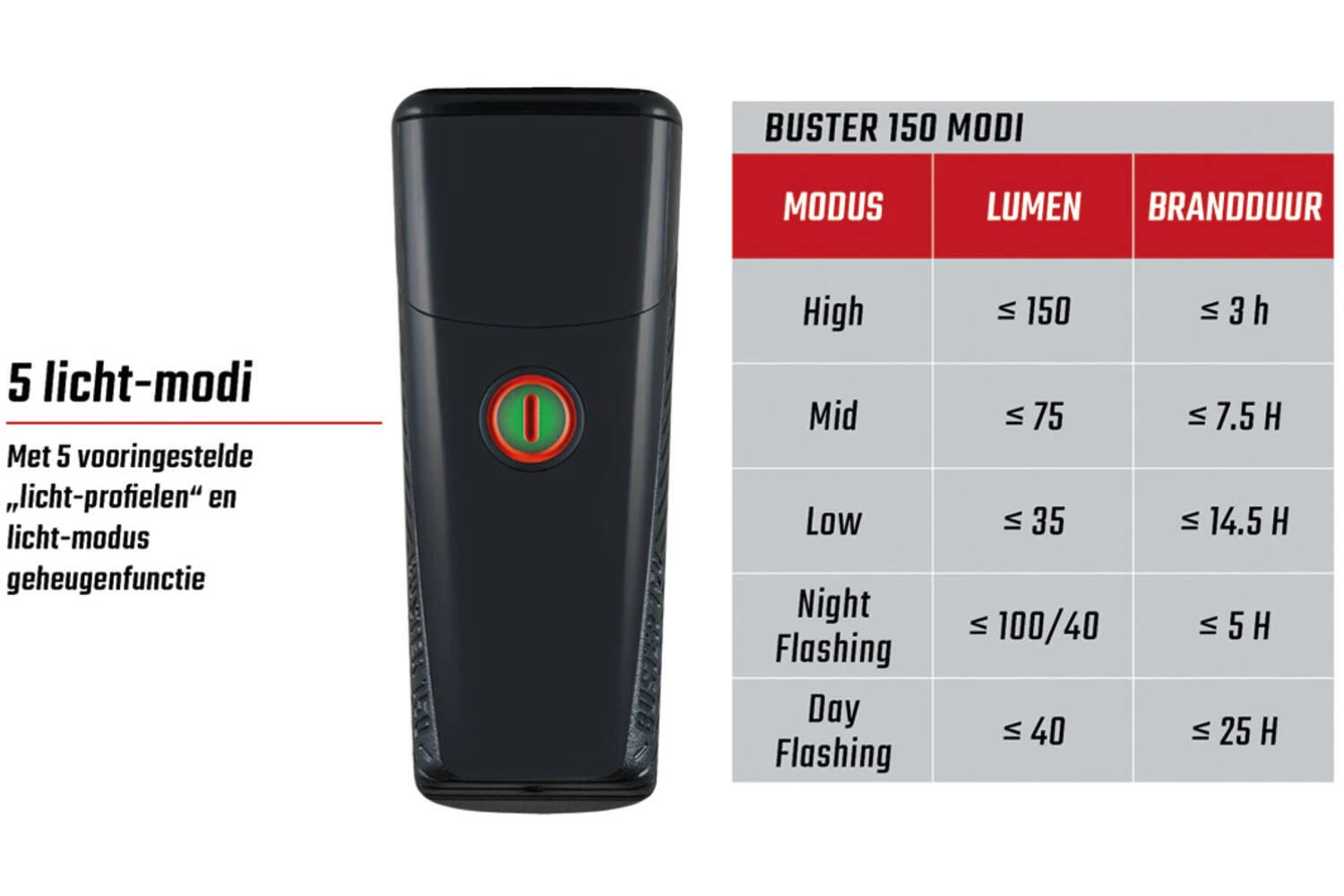 Five light modes: power mode (150 lm), mid mode (75 lm), low mode (35 lm), night flashing (100/140 lm), day flashing (40 lm)