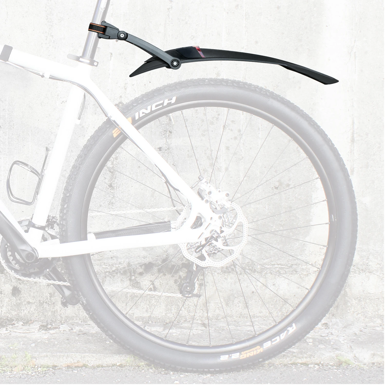 Best protection with high luminosity! The NIGHTBLADE MTB mudguard for the rear wheel is an enlightening example of integrated bicycle solutions. It not only provides optimal splash protection the NIGHTBLADE also ensures greater safety in road traffic from the integrated rear light. The rear light with integrated rechargeable battery can be removed and charged with a USB connection. The spoilers of softer plastic serve as edge protectors when getting on or off the bike. The simple quick-release mounting system enables the NIGHTBLADE to be mounted on almost all seat posts using powerstraps and the 2-joint technology enables them to be optimally adjusted. The mudguards are suitable for mounting with 26‘‘, 27.5‘‘ and 29‘‘ tyres.